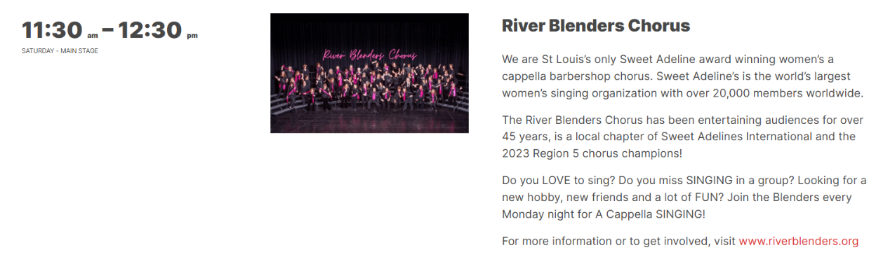 Type of event: Performance Start time: 11:30am End time: 12:30pm Venue: St. Louis Art Fair Main Stage Description: